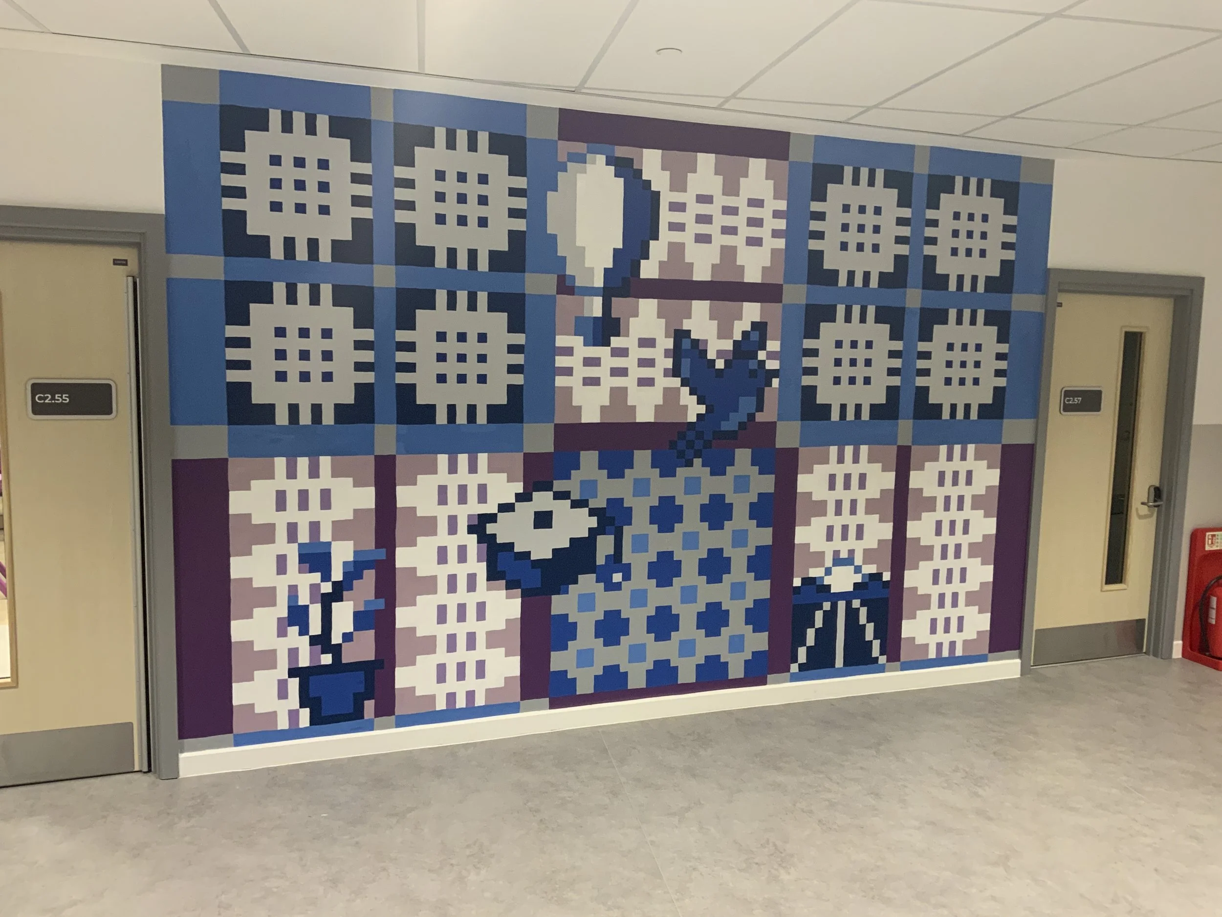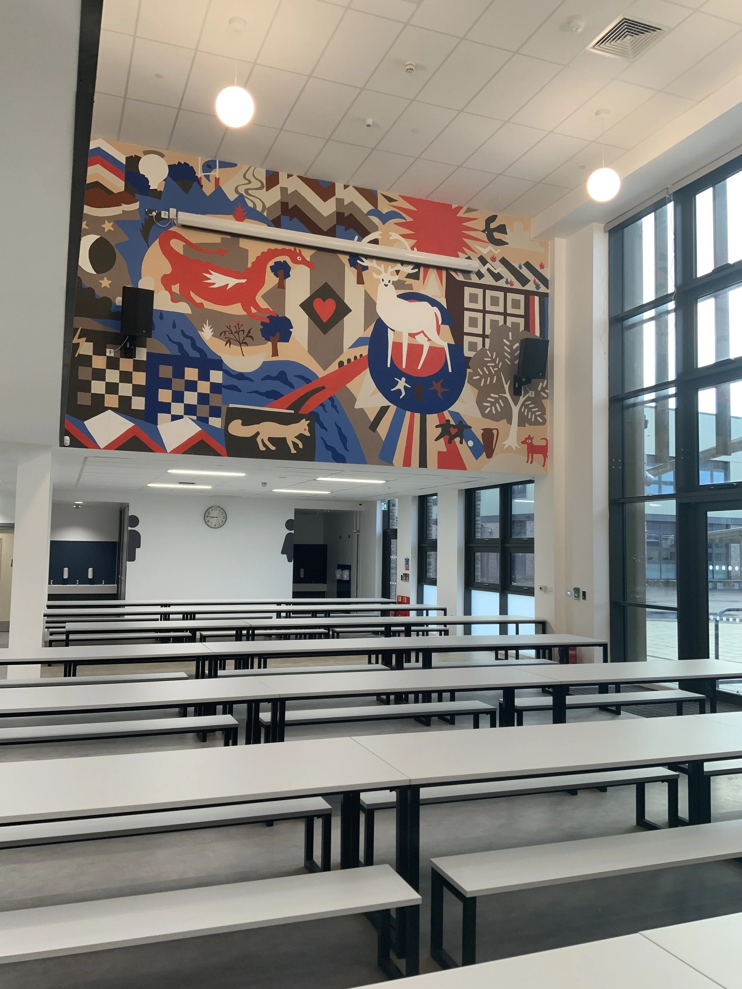 The Fairwater Campus project involved the design and delivery of three murals across a newly built multi-school campus in Cardiff, bringing together mainstream and specialist education settings within a shared environment. Delivered on a live construction site, the project required close coordination with contractors and site managers, working within strict timelines, access constraints, and health and safety requirements. Each mural was designed to reflect the identity of its specific space while contributing to a wider visual language across the campus, rooted in themes of Welsh art and craft.